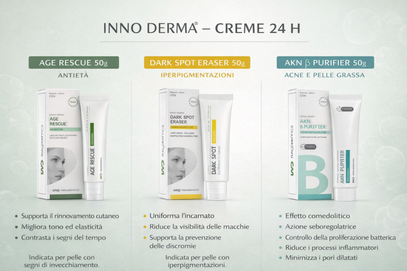 Le creme INNO DERMA® Essentials di INNOAESTHETICS: massima biodisponibilità e sinergia dalle formulazioni e dai principi attivi, per una migliore risposta globale e migliori risultati di sicurezza ed evidenza clinica. La Linea INNO DERMA® Essentials comprende la Linea 24h CREAM: esclusive creme di mantenimento post peeling della Linea Inno Exfo®, valido supporto per il Dermatologo e il Medico Estetico che desidera mantenere i risultati ottenuti con i trattamenti ambulatoriali Anti-aging, Anti-imperfezioni e Depigmentanti.